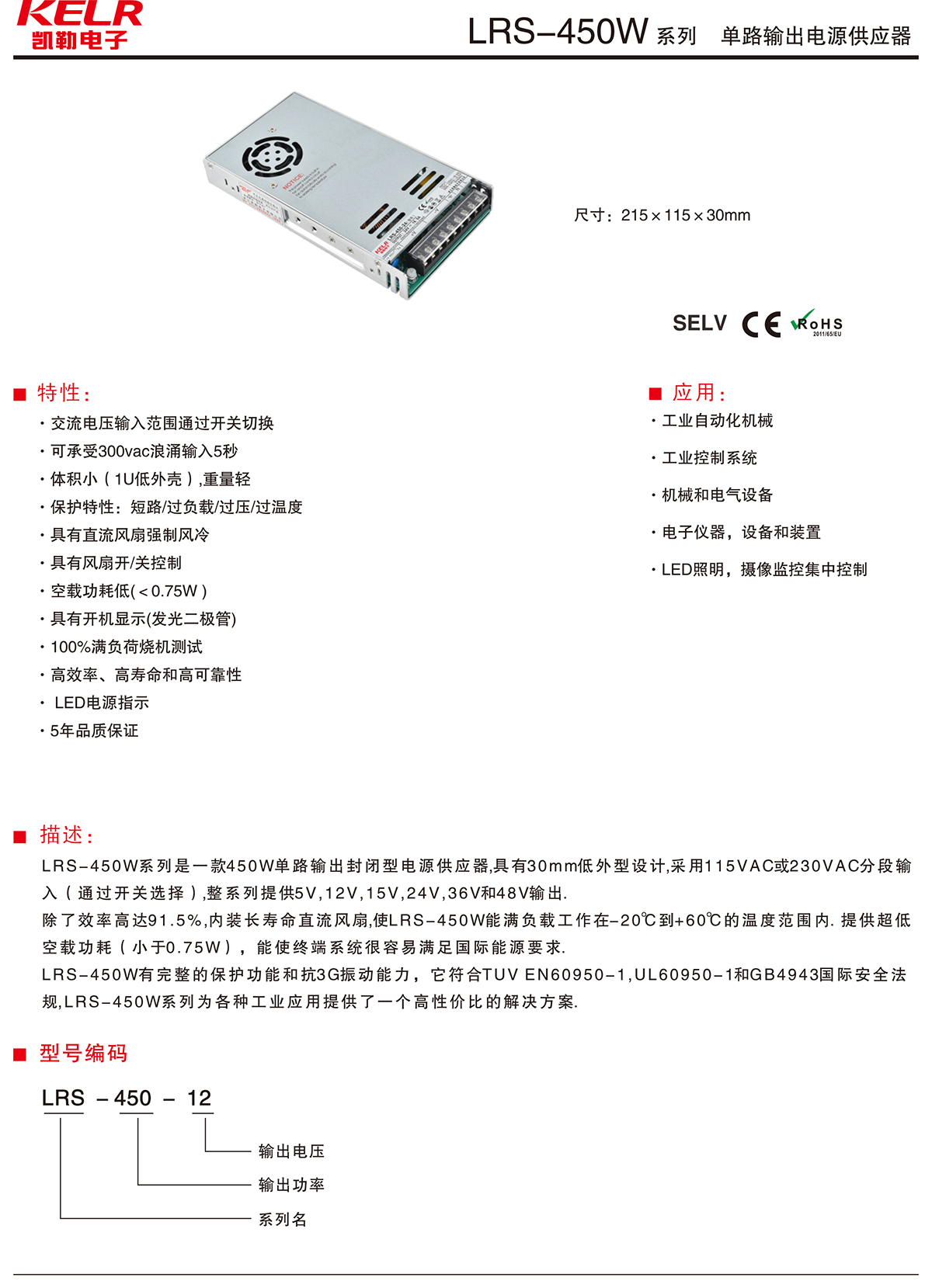 LRS-450-12 系列 单路输出电源供应器