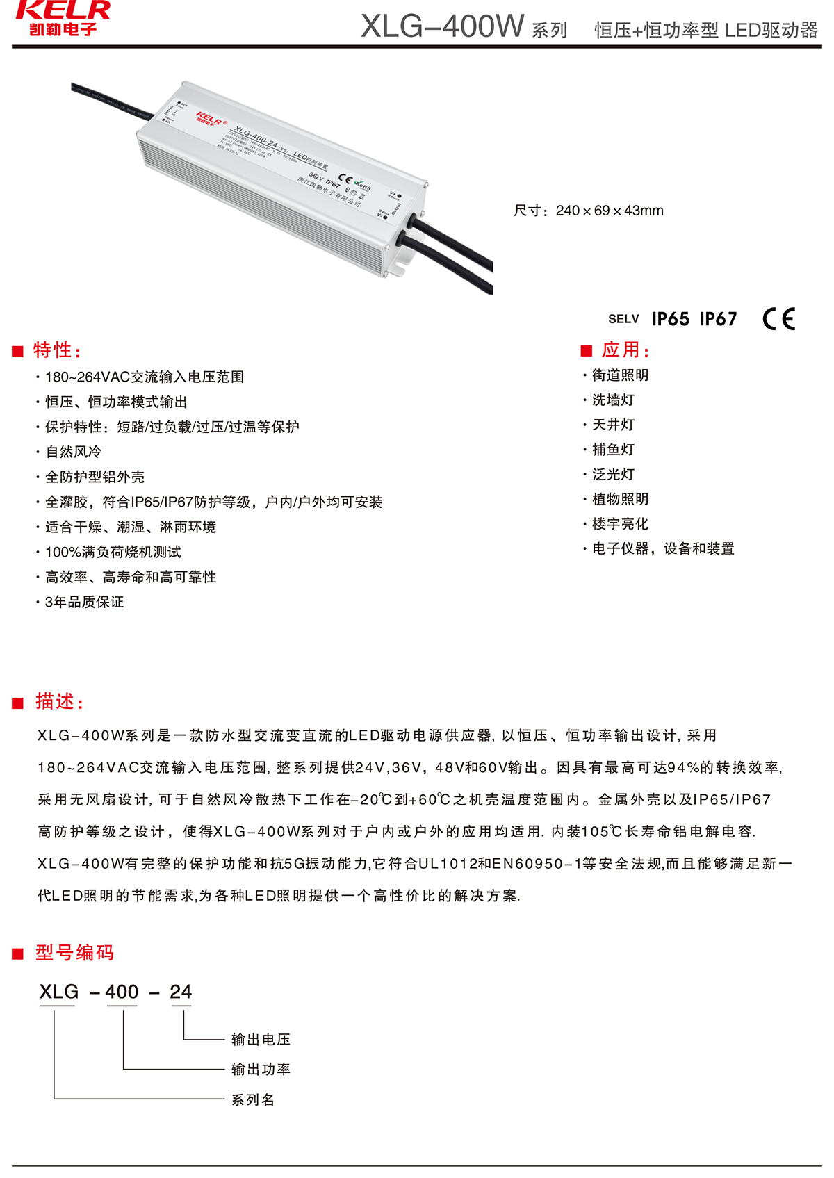 XLG-400-24 系列 恒压+恒功率型LED驱动器