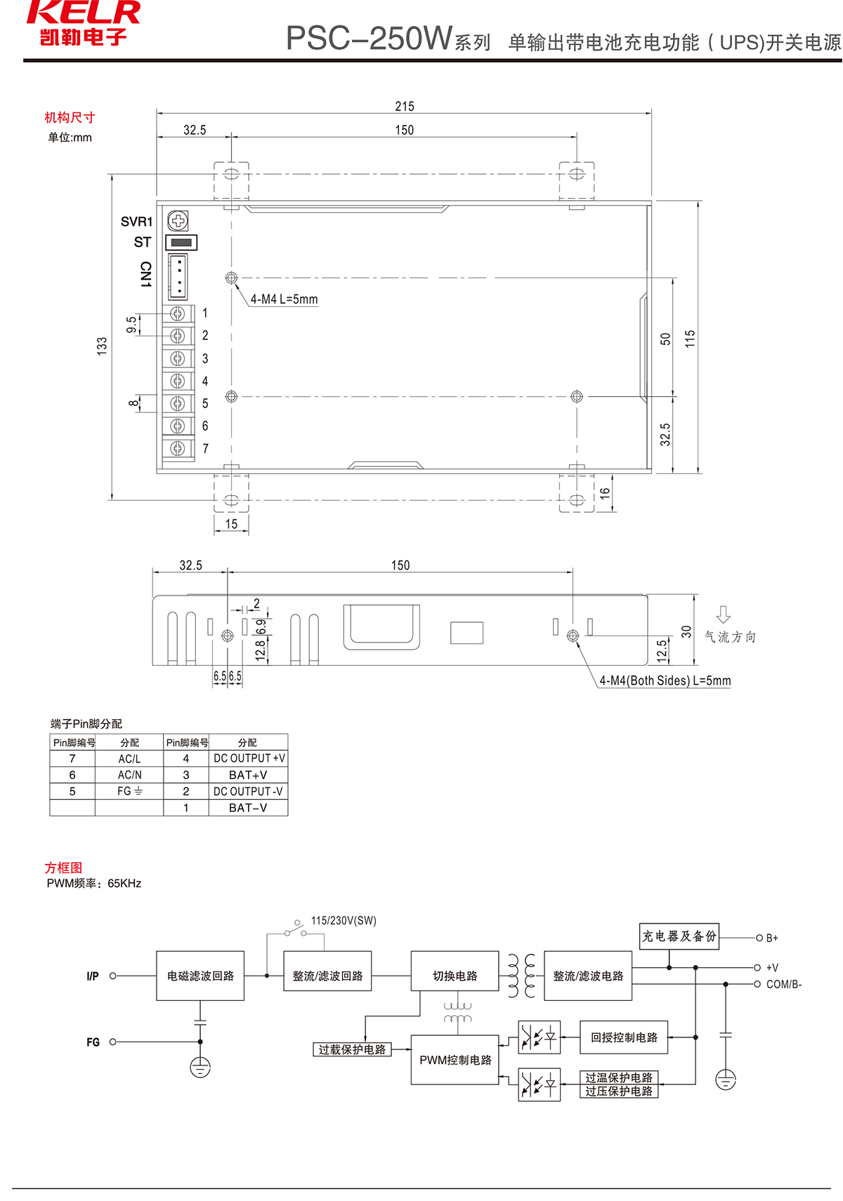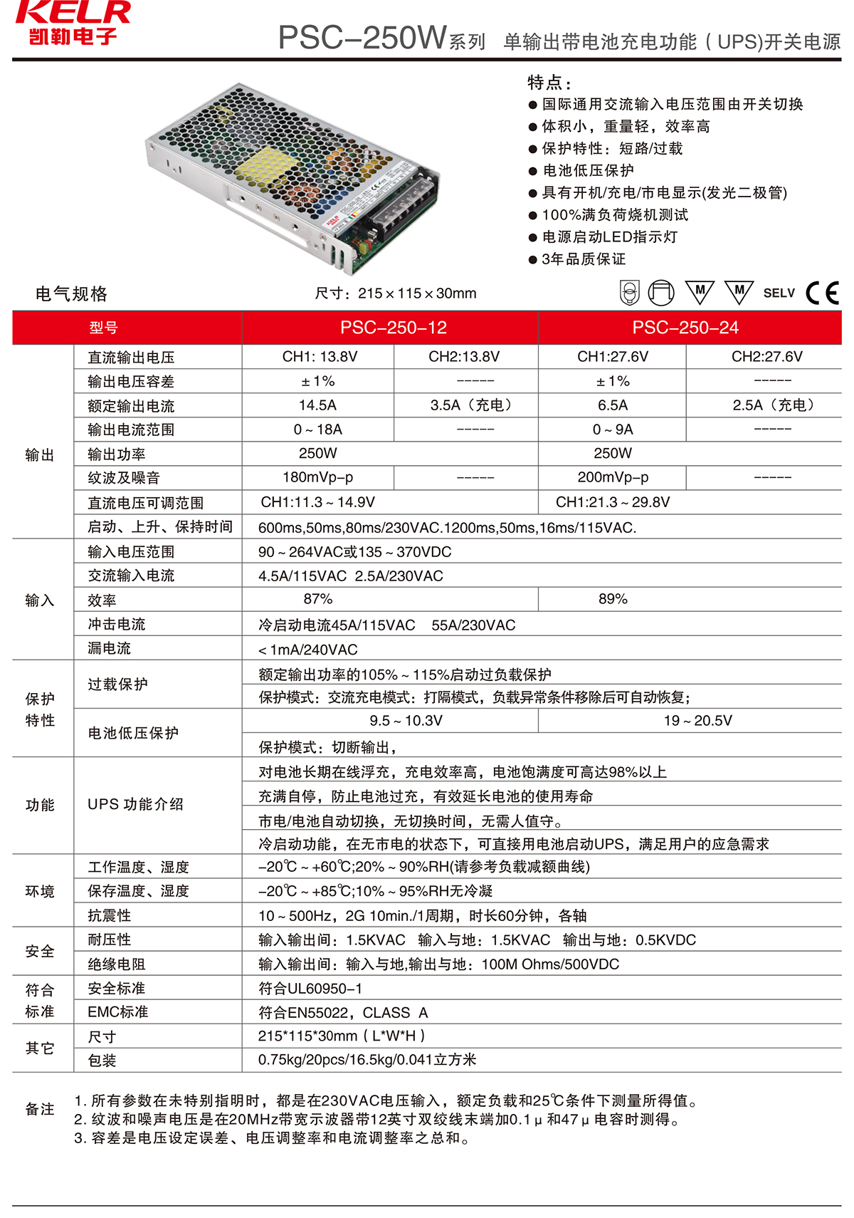 PSC-250W 系列 单输出带电池充电功能(UPS)开关电源