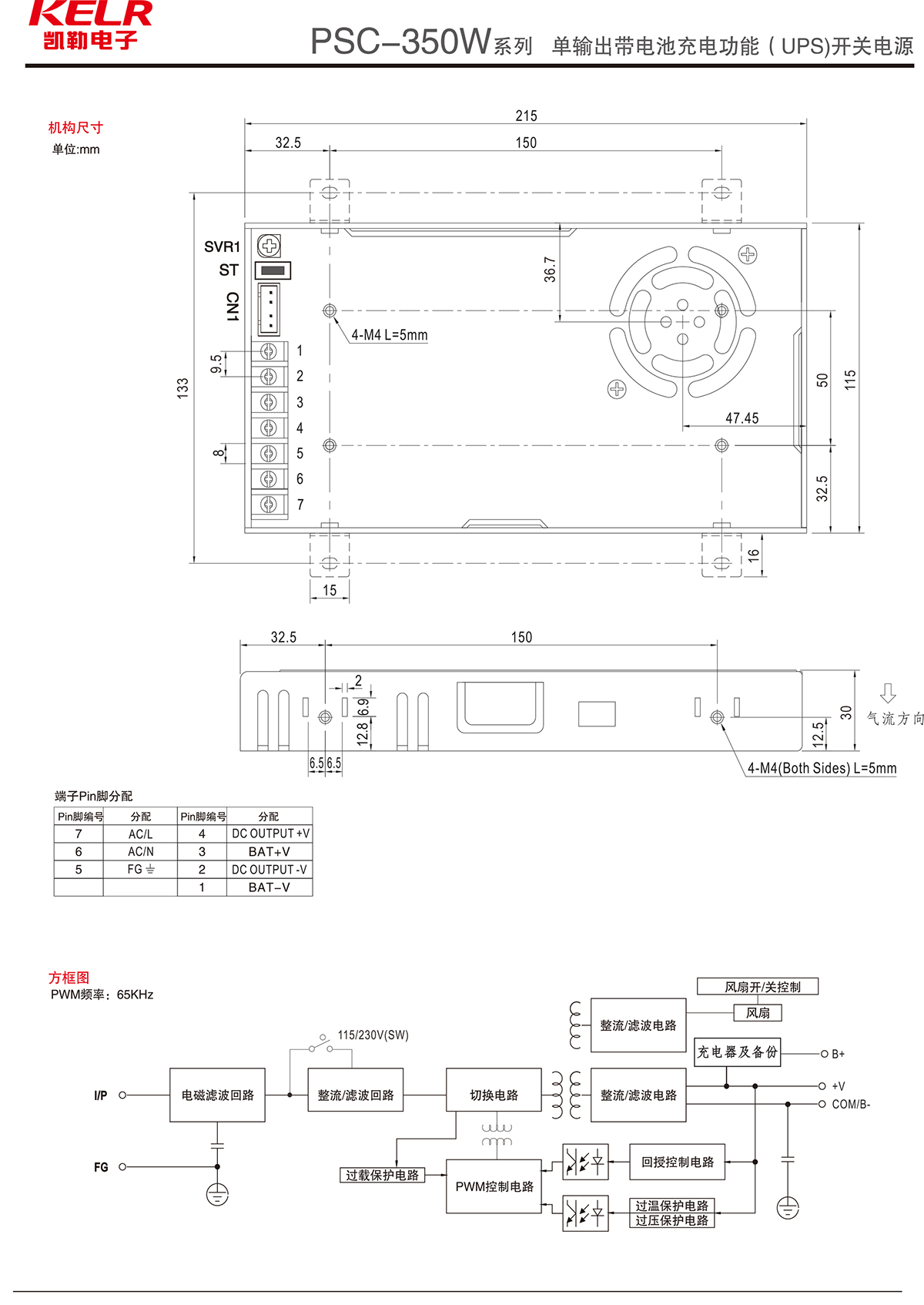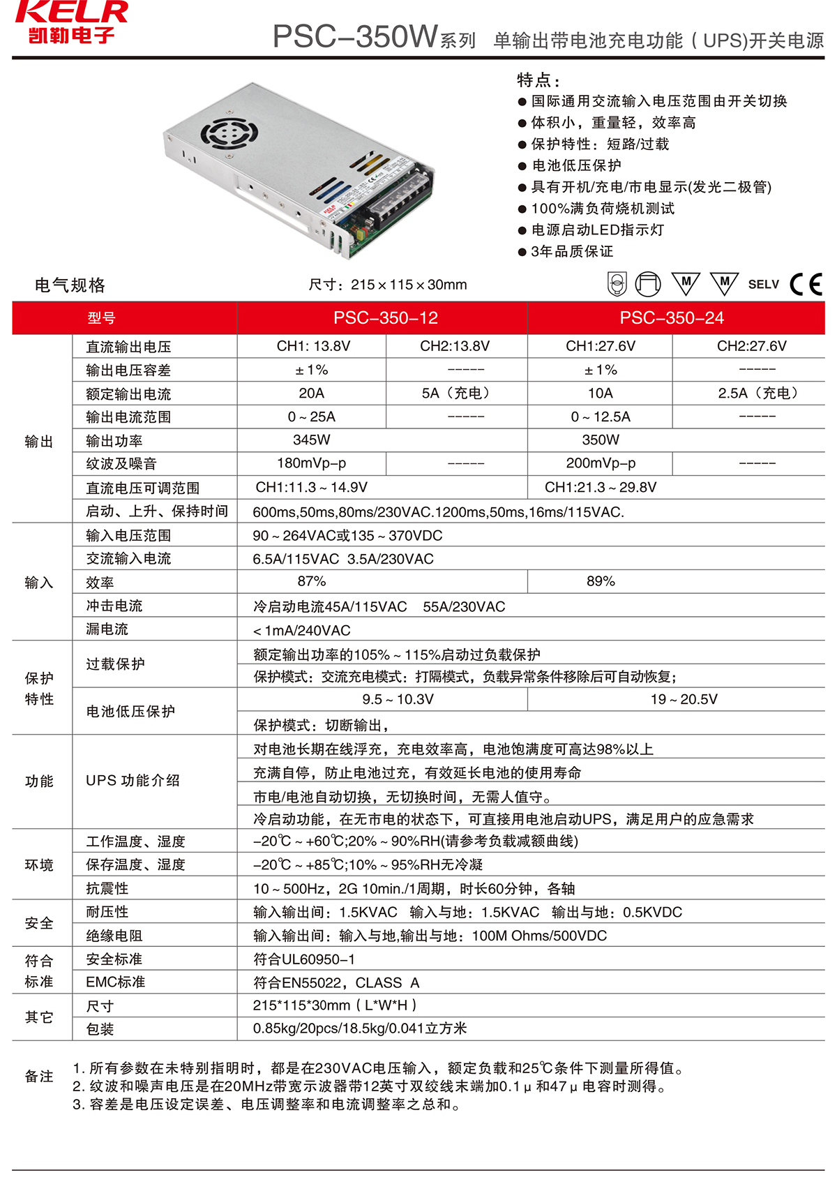 PSC-350W 系列 单输出带电池充电功能(UPS)开关电源